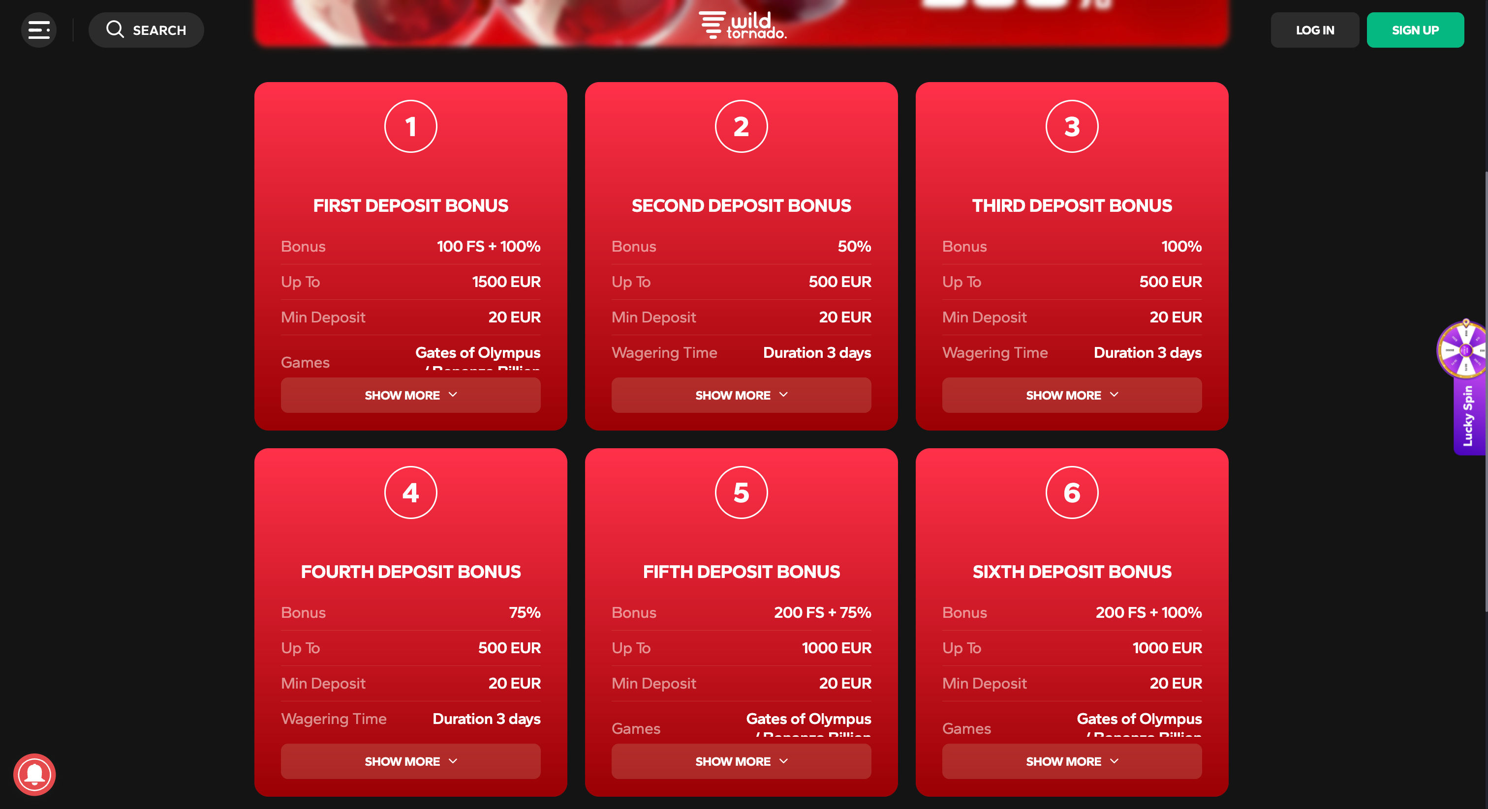 The welcome bonus at Wild Tornado is designed to give new players an exciting start. Here’s a breakdown of what you can expect upon making your first deposits: