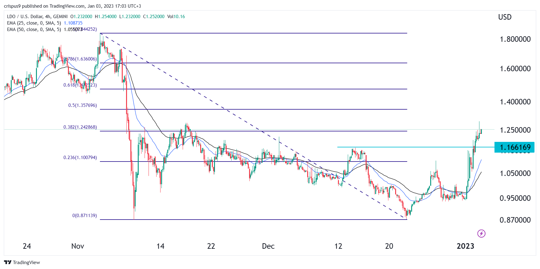 The 4H chart shows that the LDO price has made a strong rebound in the past few weeks. In this period, it has managed to move above the 38.2% Fibonacci Retracement level. It has also risen above the 25-day and 50-day moving averages and the important resistance level at $1.1660, which was the highest point on December 14.