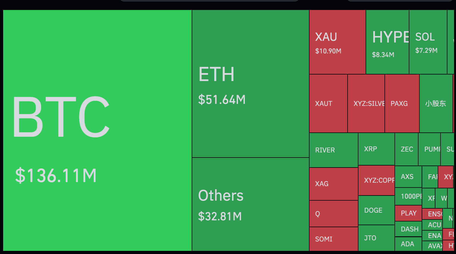 Over the past 24 hours, 117,330 traders were liquidated, totaling $342.79 million. Long positions accounted for roughly $232 million of those losses. Bitcoin-linked liquidations accounted for $136.11 million, while Ethereum liquidations totaled $51.64 million.